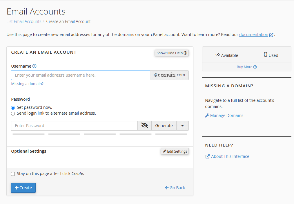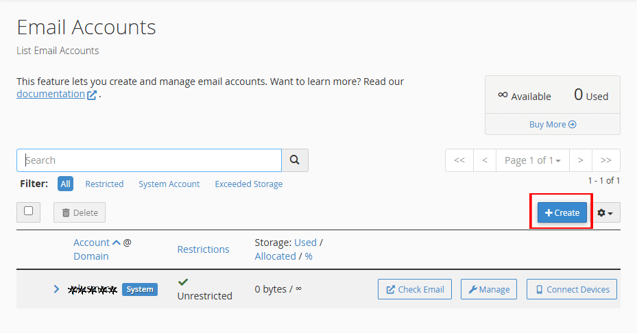 - کلیک بر روی “Email Accounts”: با کلیک بر روی این گزینه، وارد صفحه ای می شوید که می توانید حساب های ایمیل موجود را مشاهده کرده و حساب های جدید ایجاد کنید.