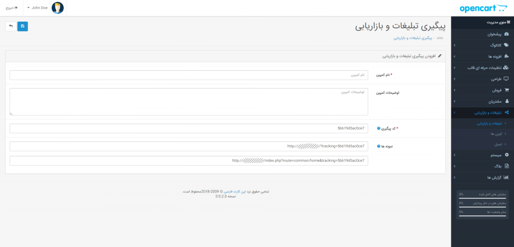 در این بخش کمپین های تبلیغاتی در طراحی سایت فروشگاهی را تعریف می کنید. که اگر از قبل داشته باشید لیستشان را برایتان نمایش می دهد و قابل ویرایش و حذف هستند. همچنین فیلتری برای جستجو در صفحه است. در صورتی که بخواهید کمپین جدی تعریف کند پس از کلیک بر روی دکمه افزودن نام کمپین مورد نظر خود، توضیحات مربوطه را درج کنید. کد پیگیری و نمونه ها بصورت خودکار پر می شود. دکمه ذخیره را کلیک کرده و کمپن خود را اجرا کنید.